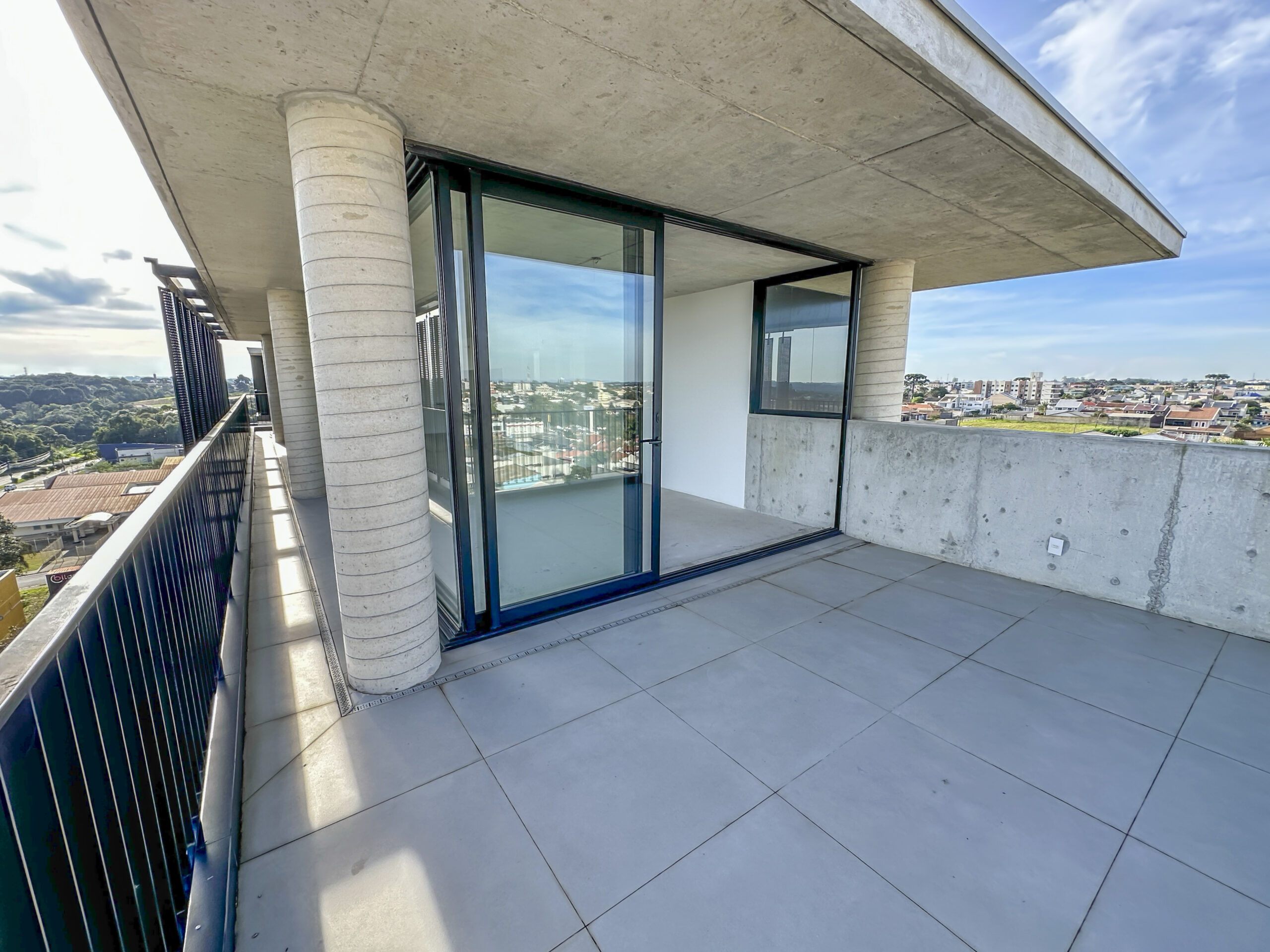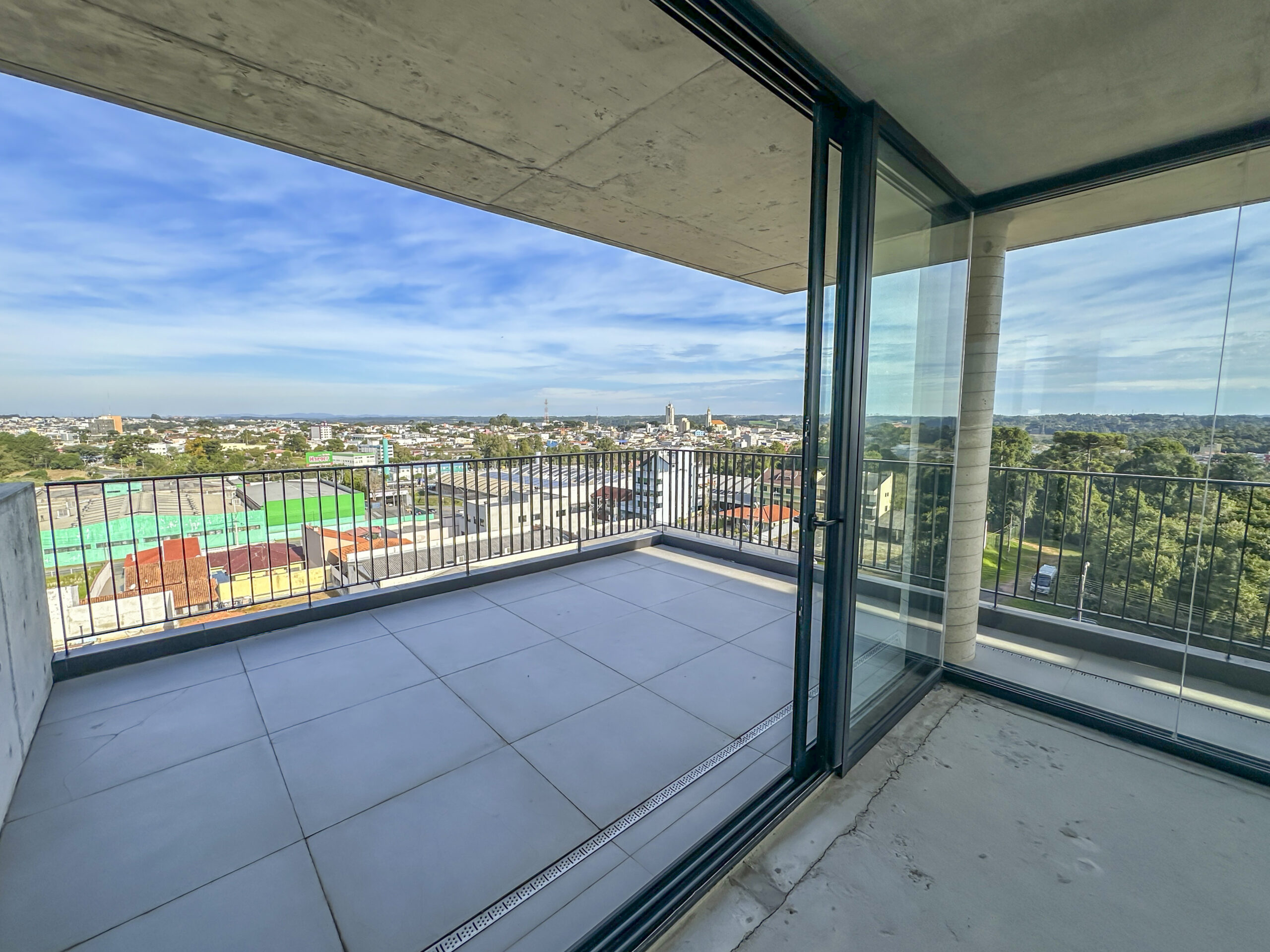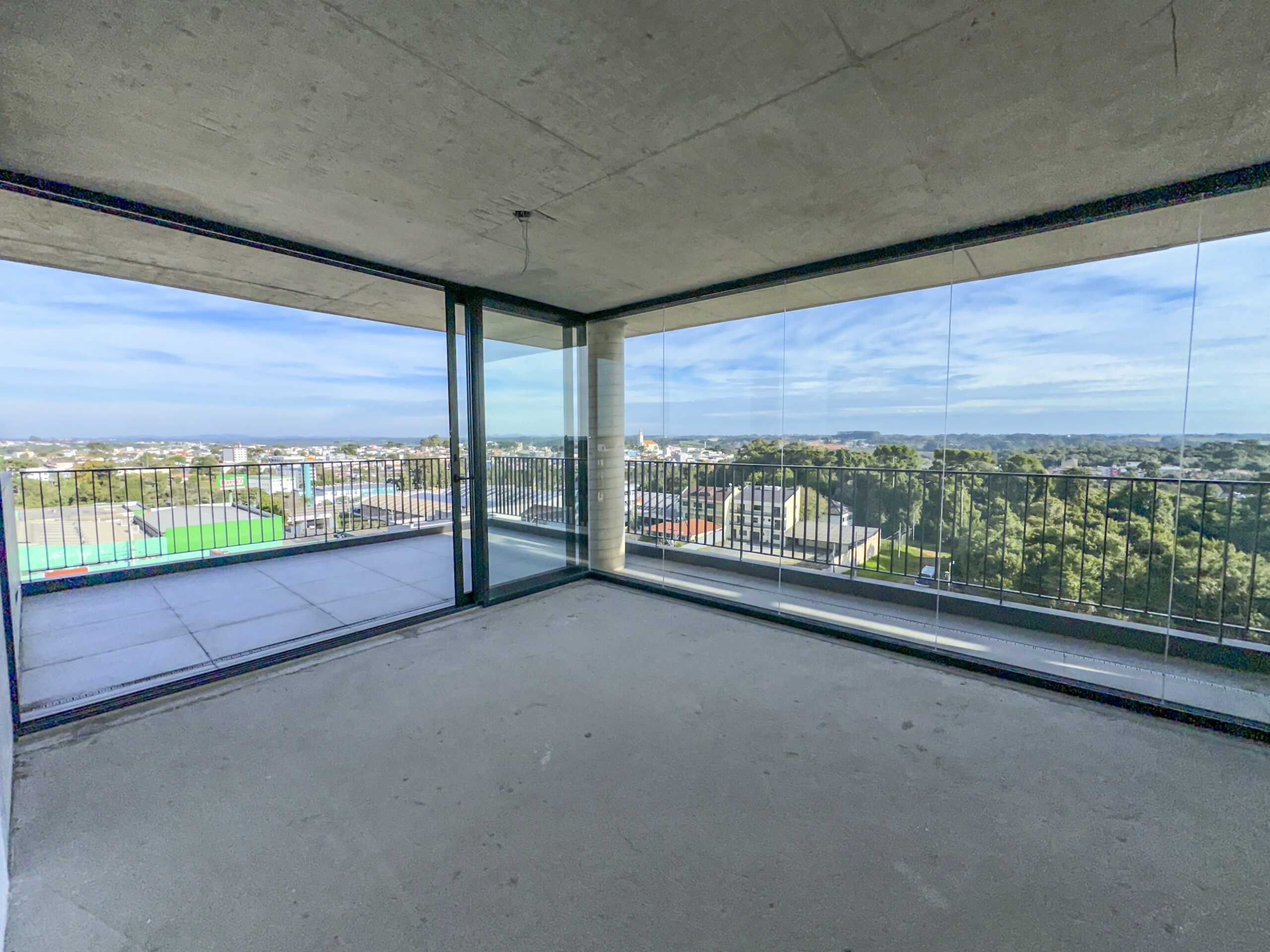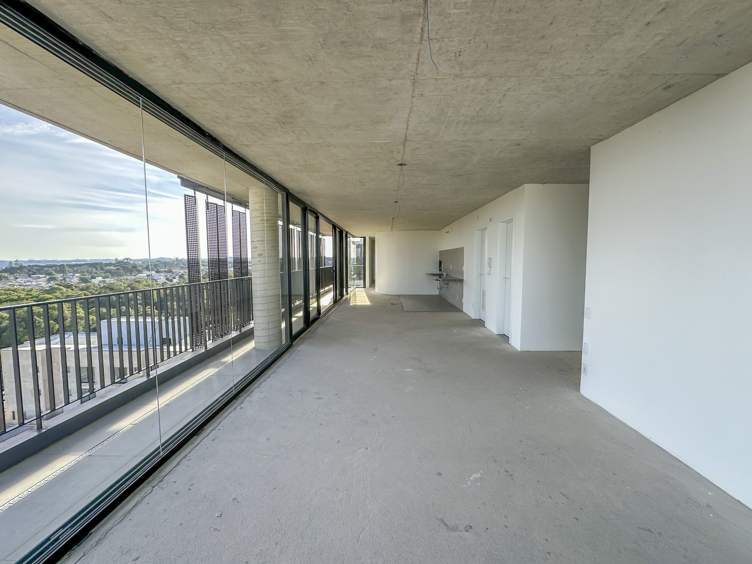 Esquadrias do piso ao teto com amplas aberturas, conectando os ambientes à varanda;