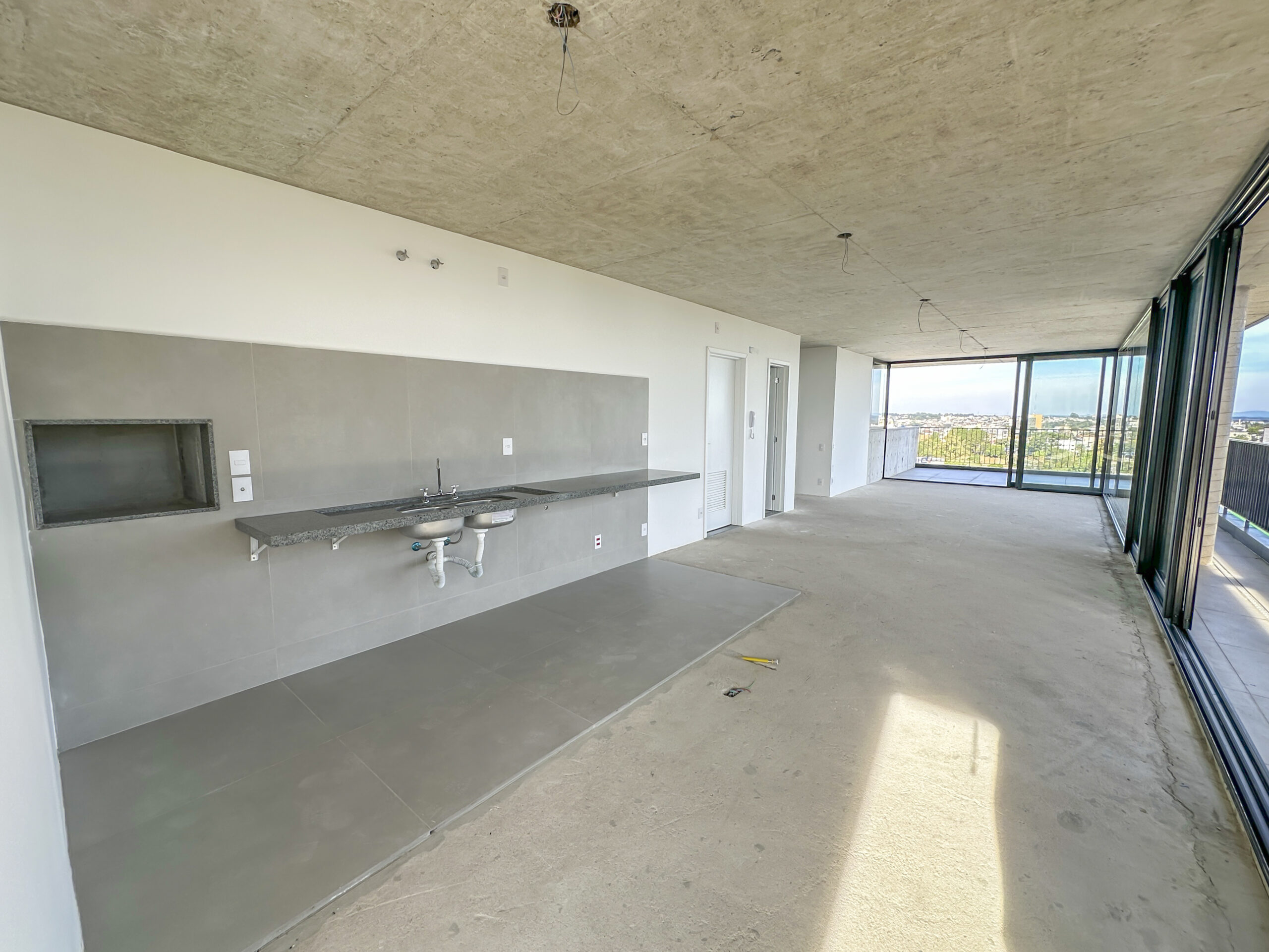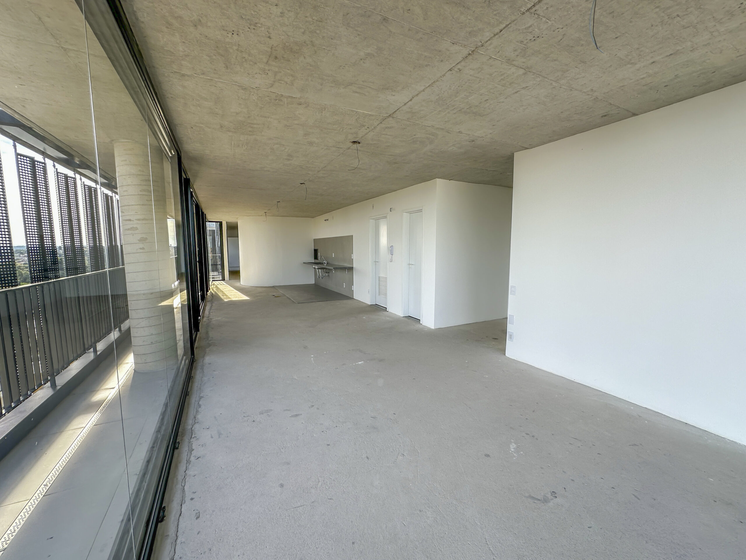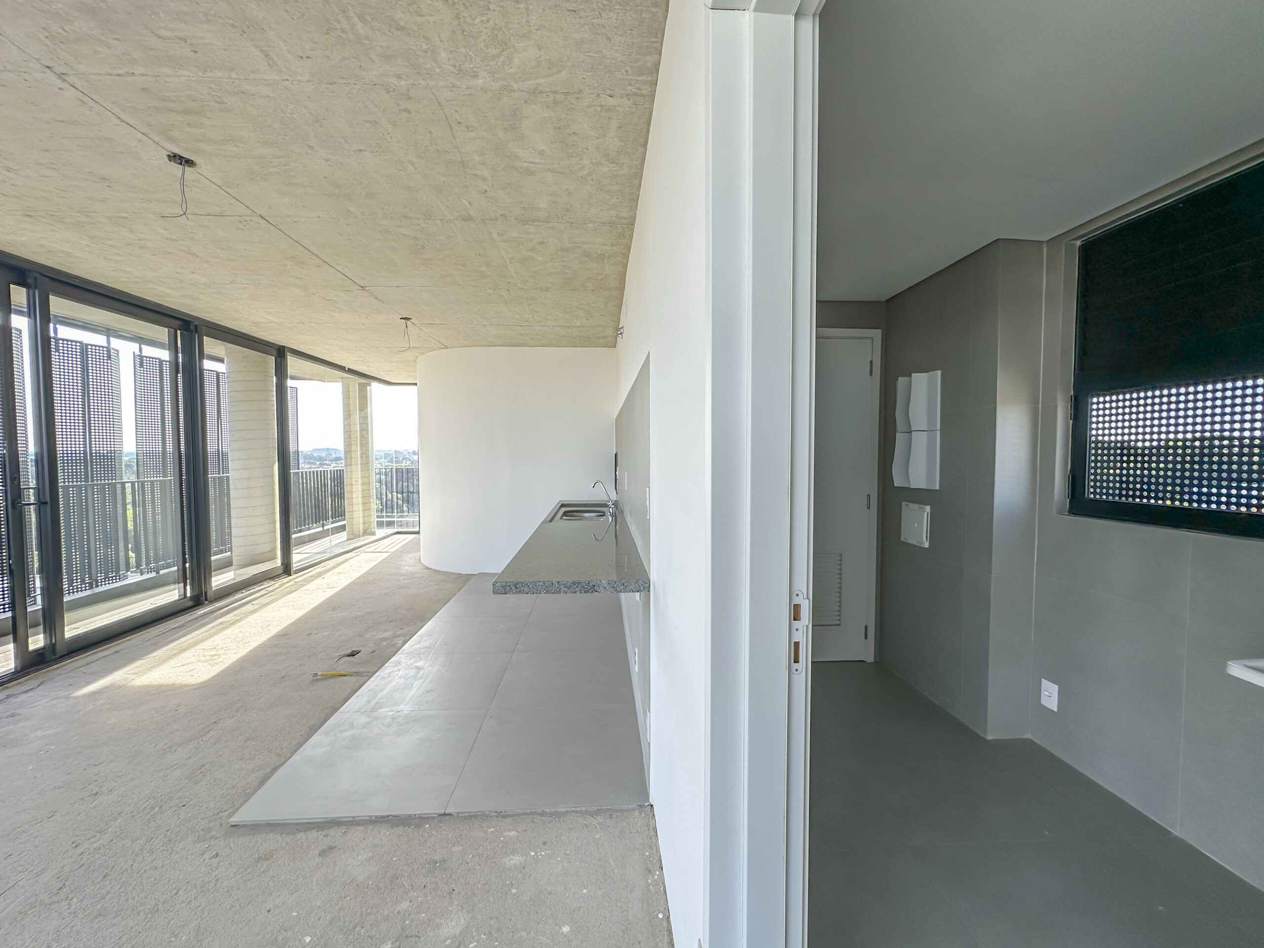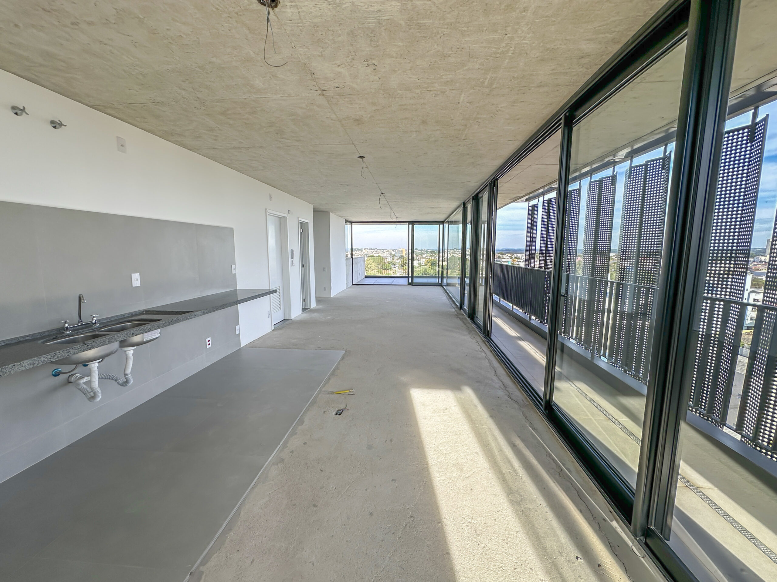 Esquadrias do piso ao teto com amplas aberturas, conectando os ambientes à varanda;