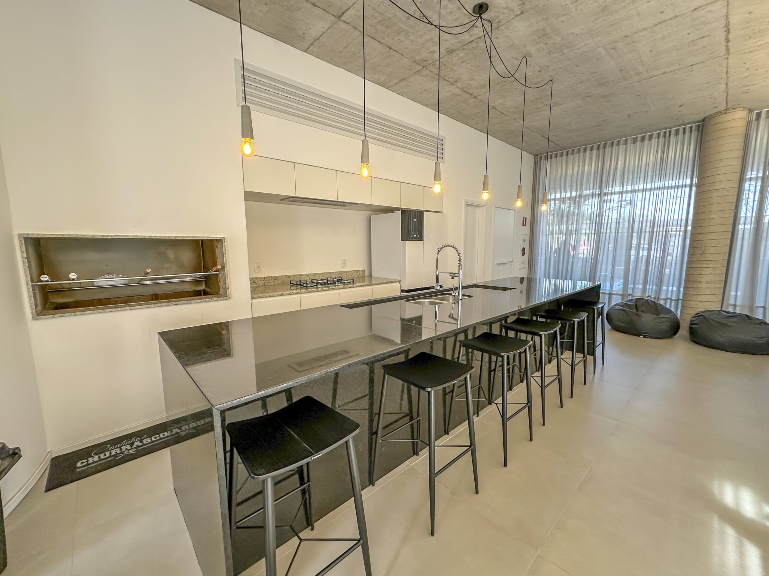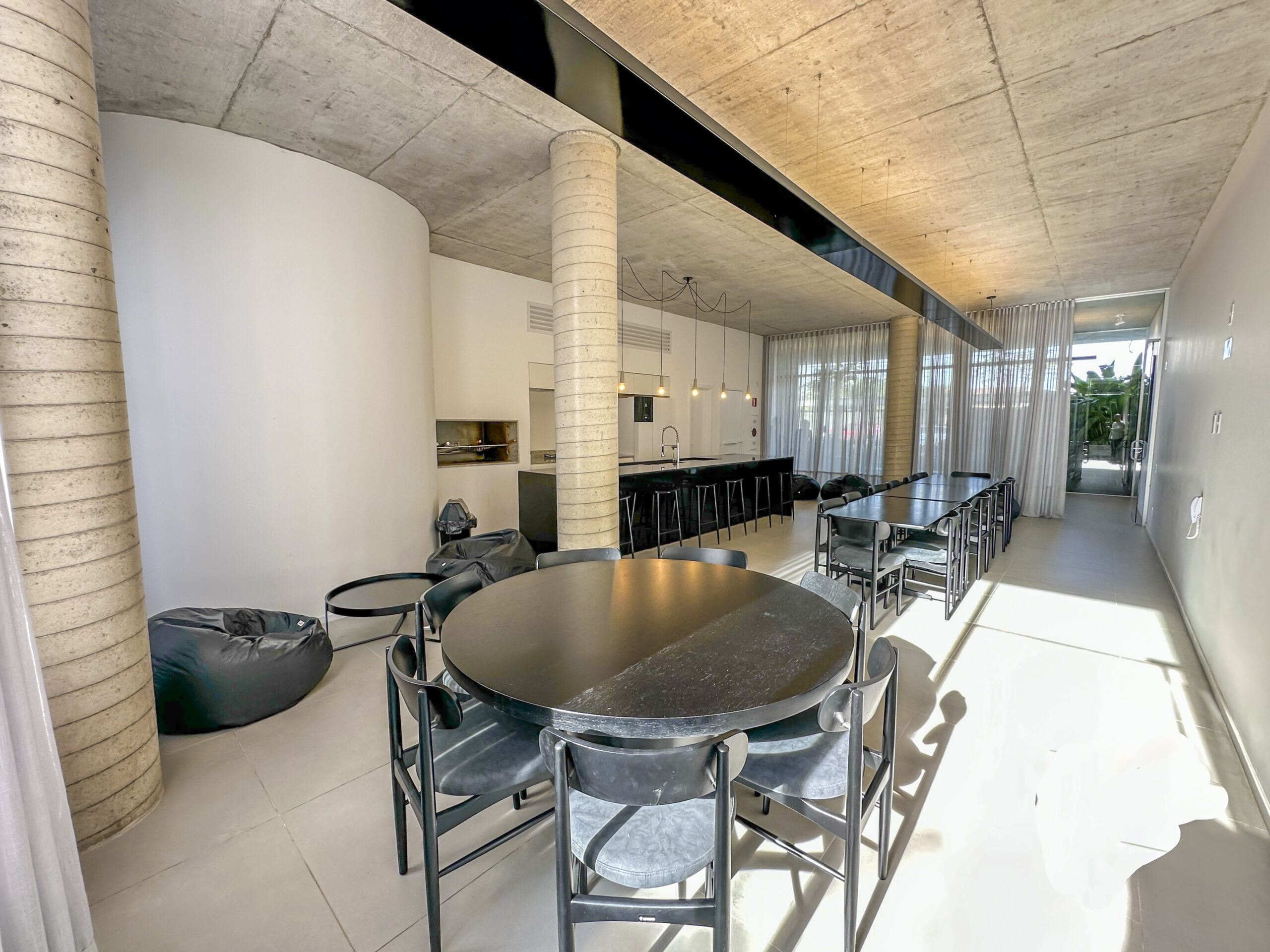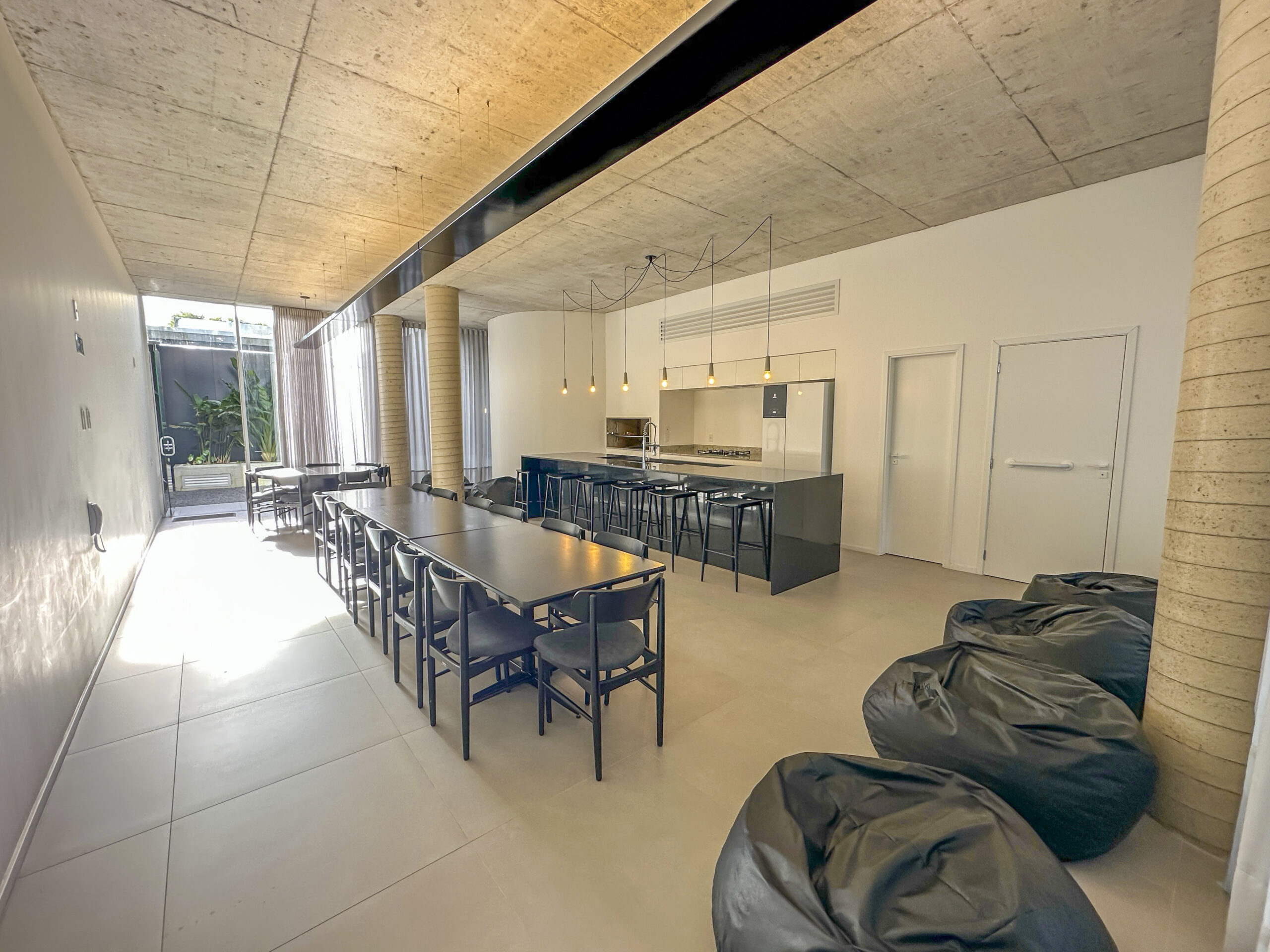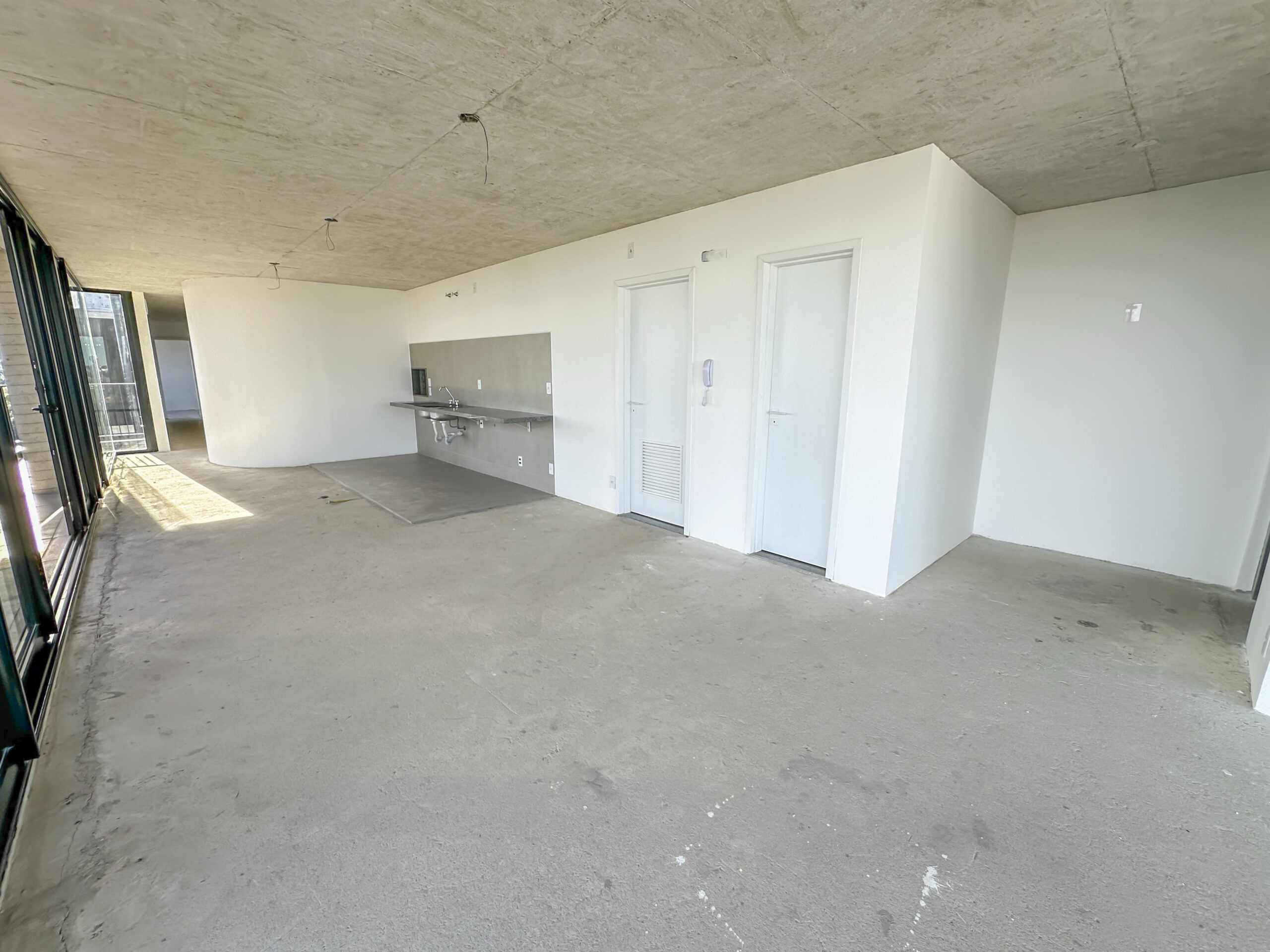 Esquadrias do piso ao teto com amplas aberturas, conectando os ambientes à varanda;