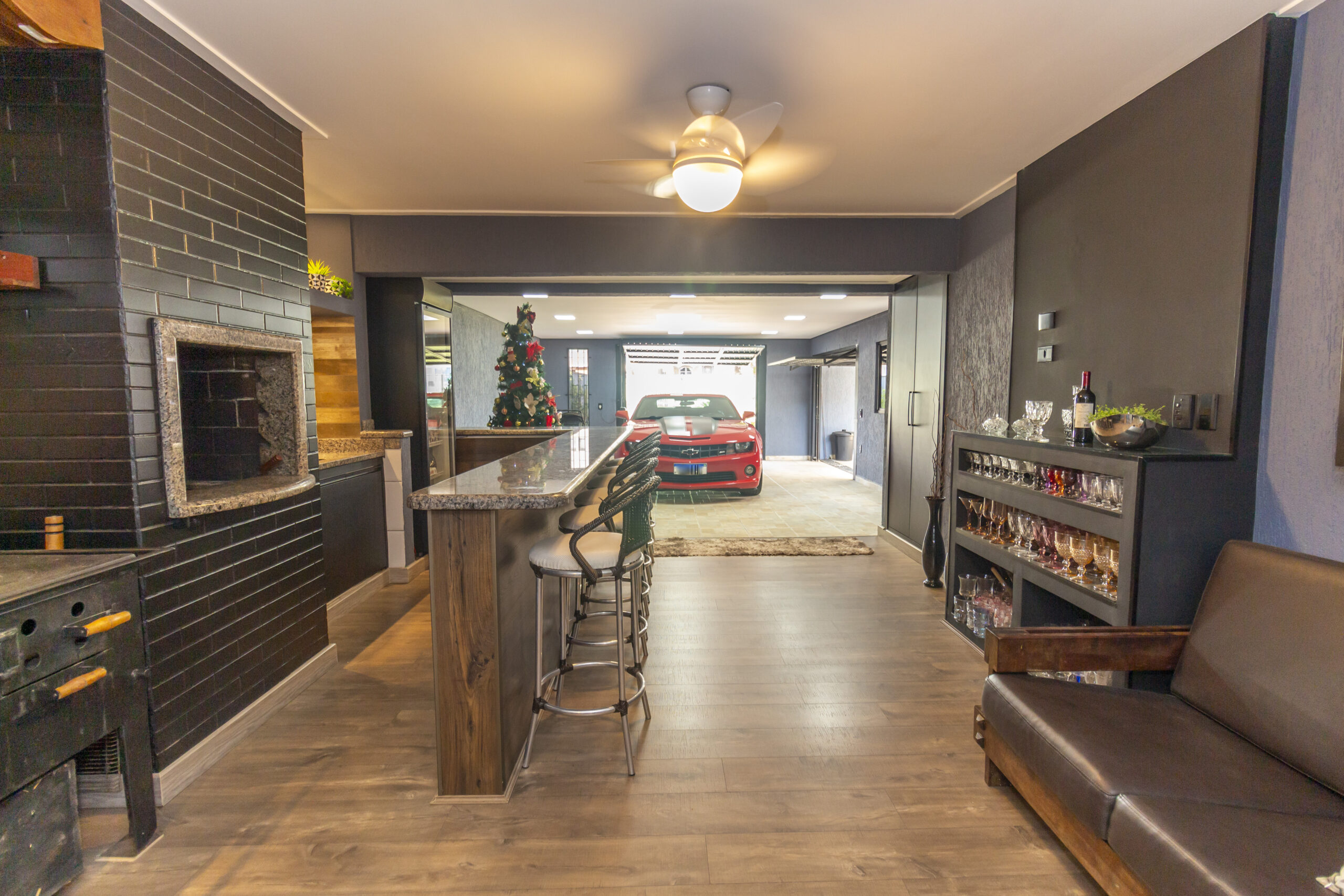 Área gourmet ampla, com 6 banquetas, forno de pizza, freezer e cristaleira;