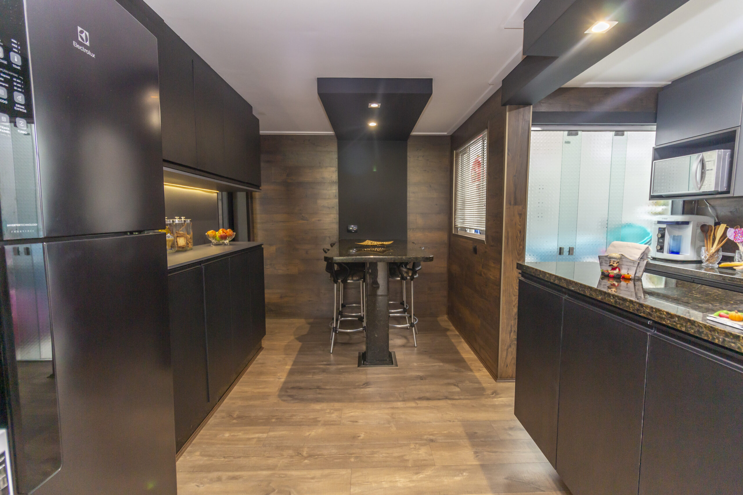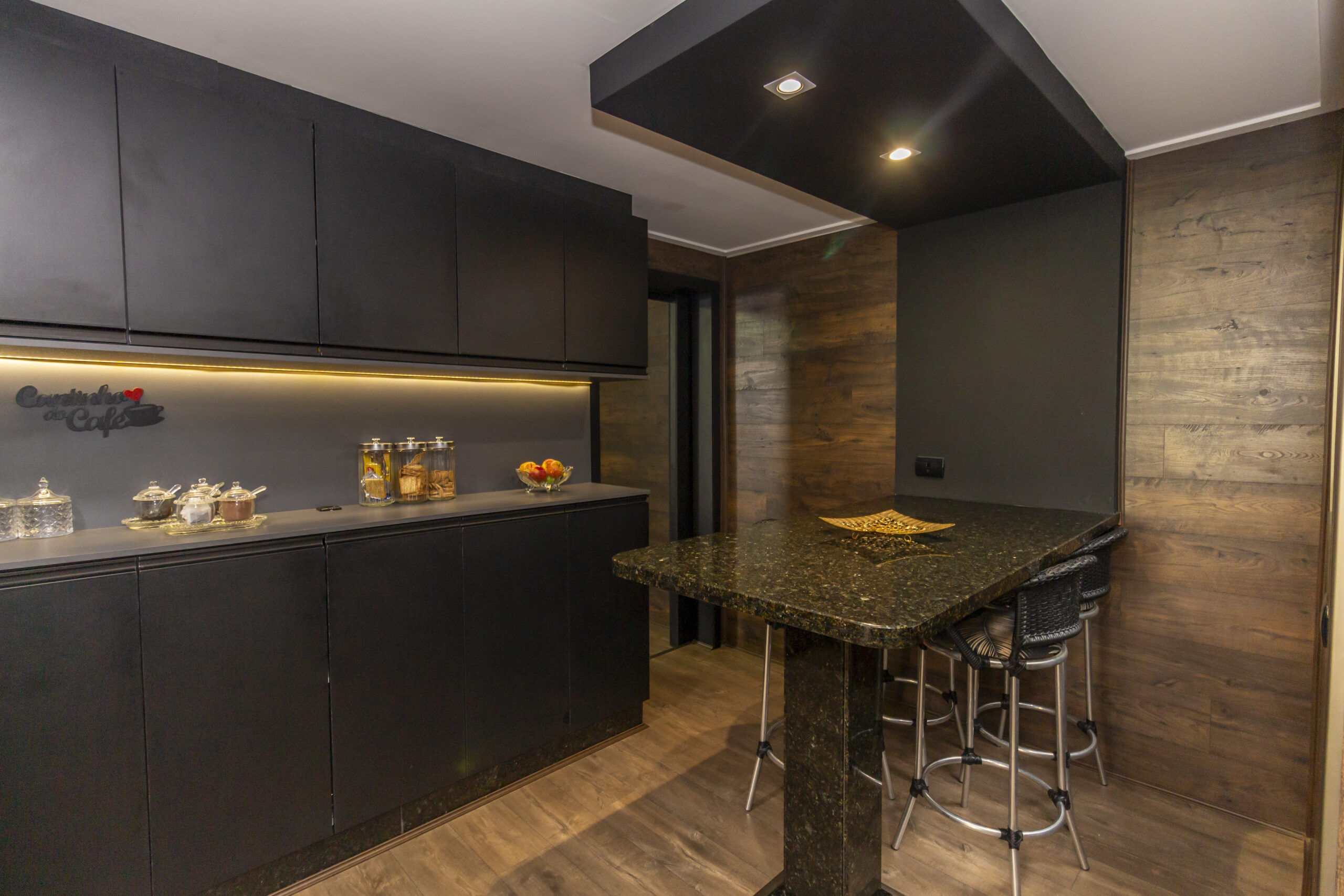 Cozinha toda planejada, sala de jantar integrada e mesa com 4 banquetas;