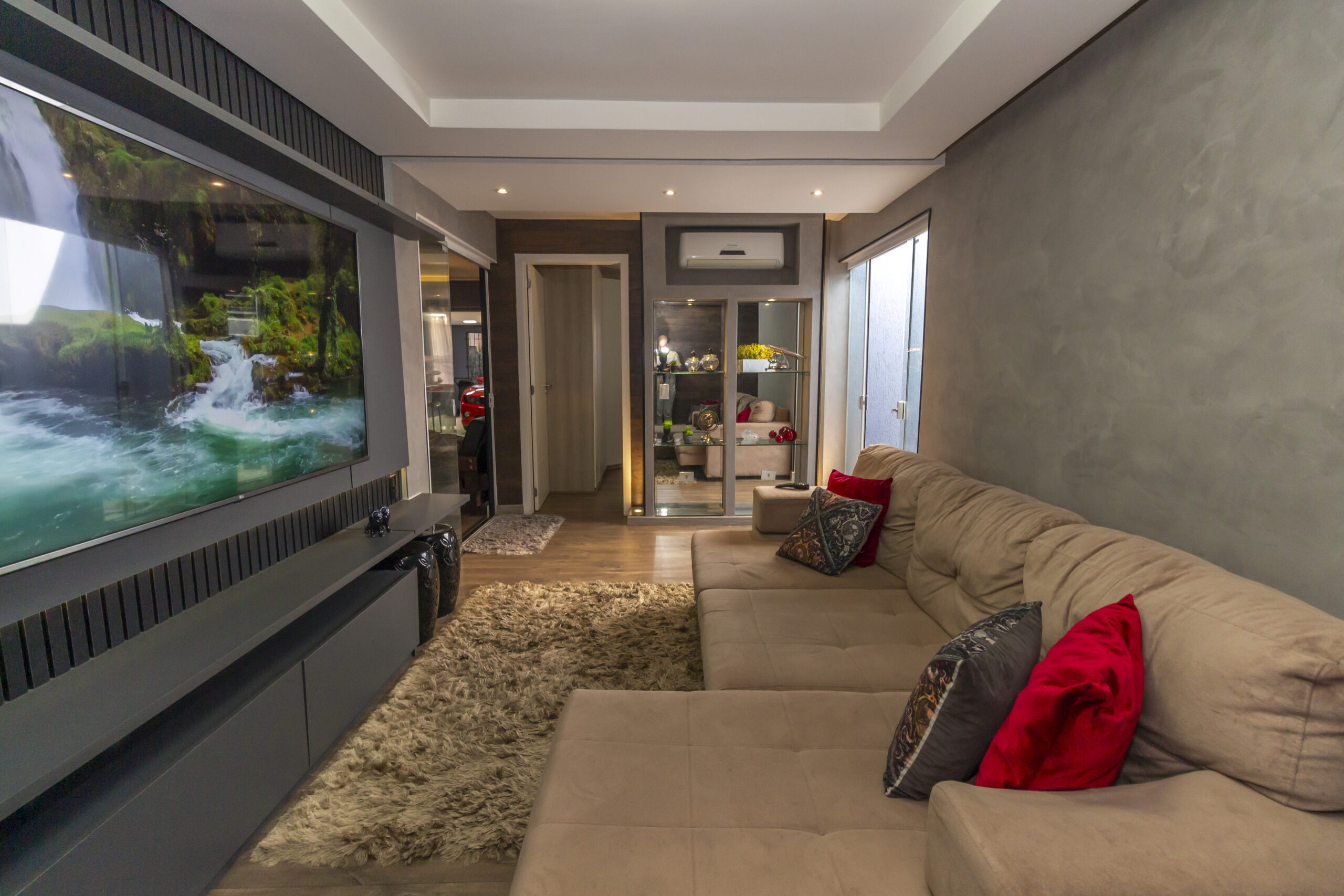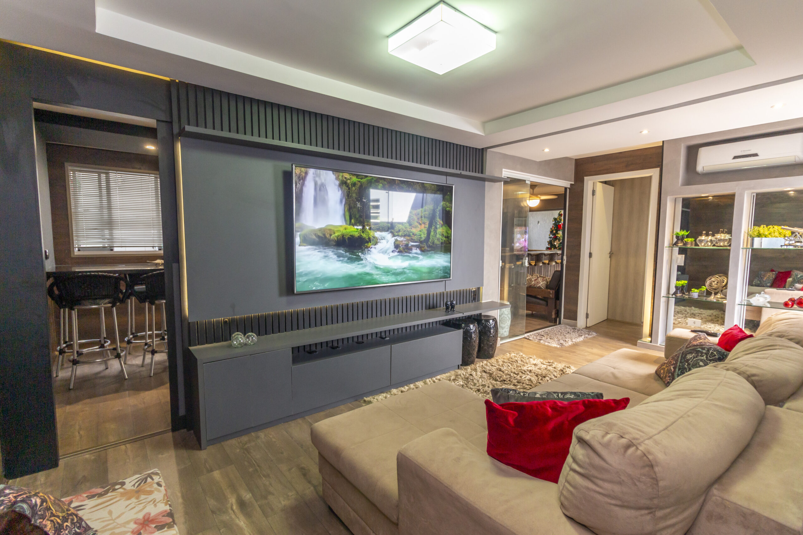Sala de estar climatizada com painel de tv, estante e parede revestida em madeira;