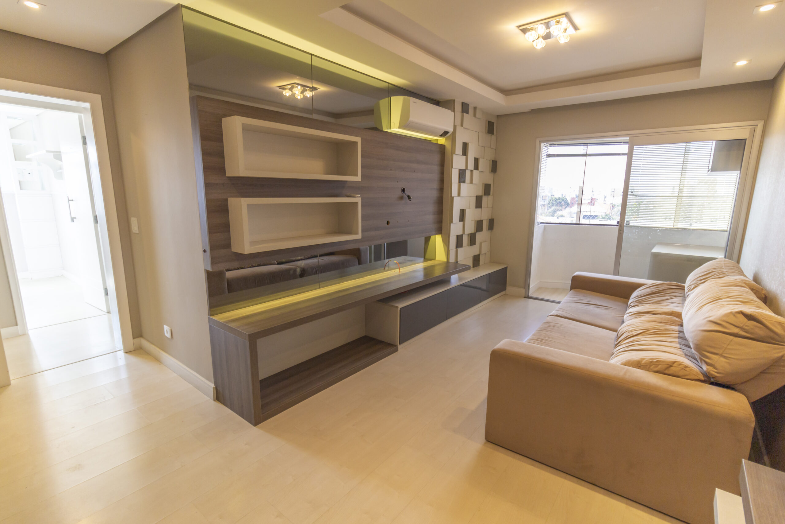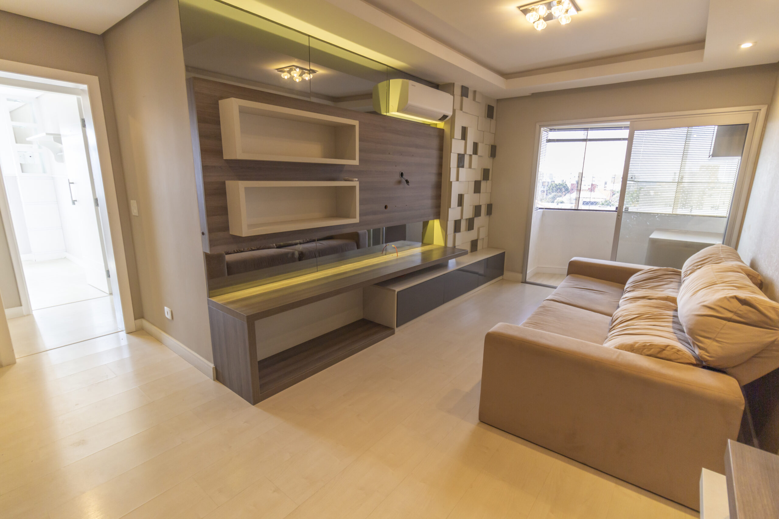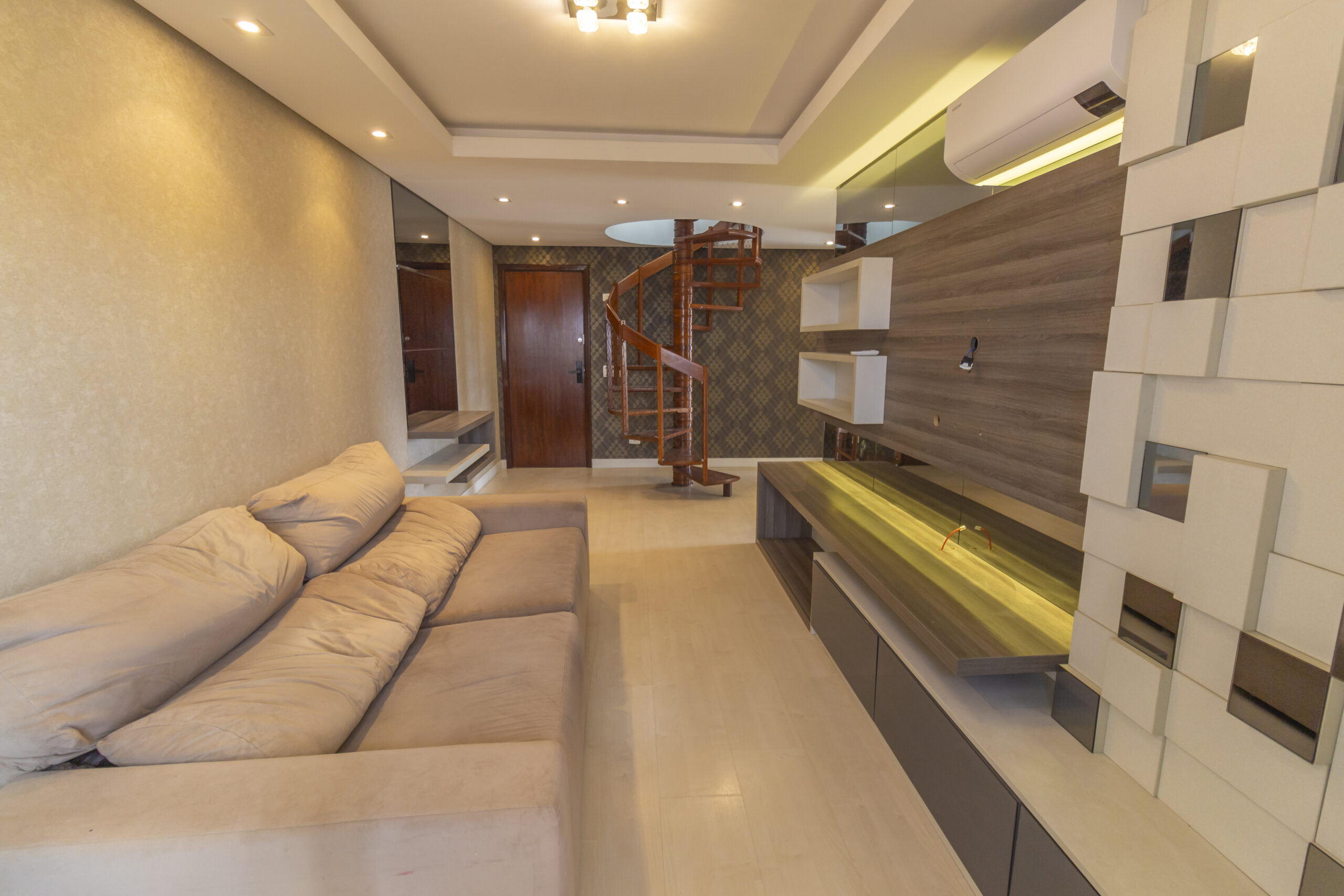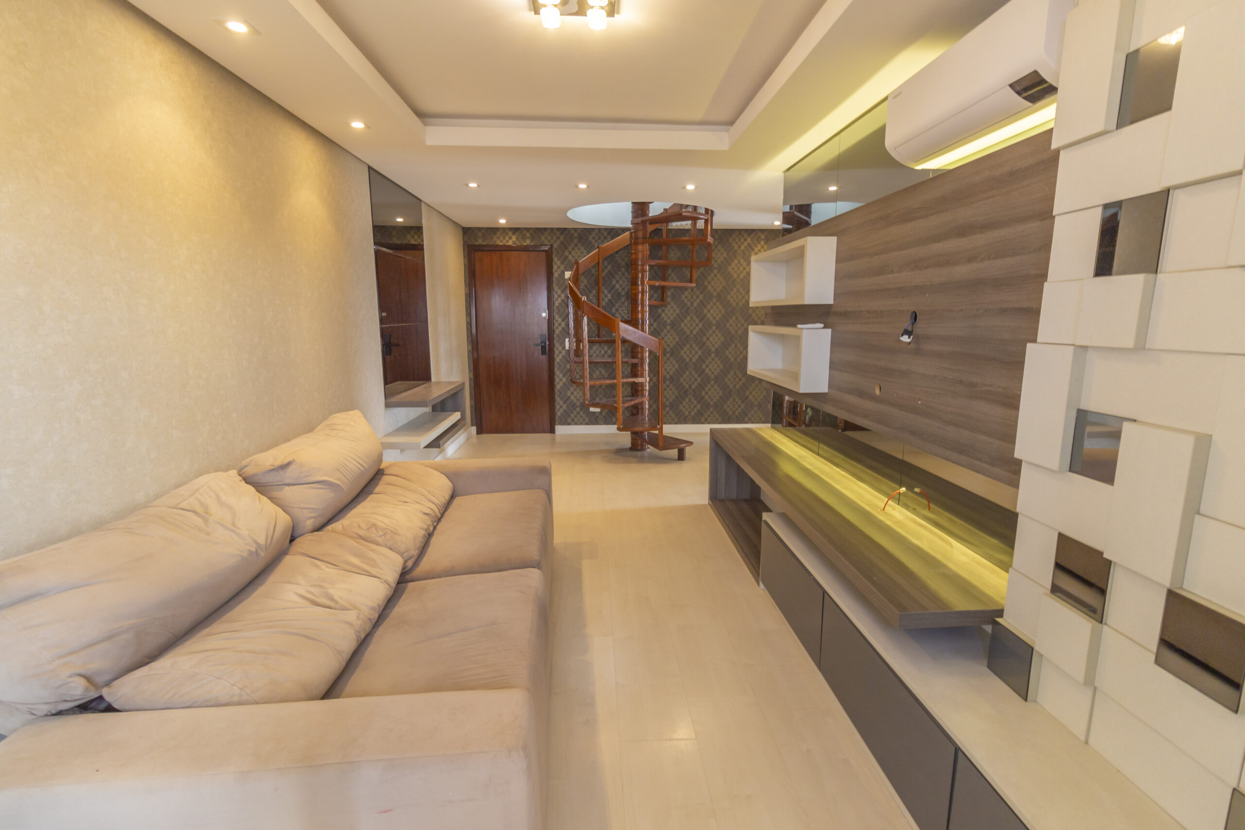 Sala ampla com painel de tv e ar-condicionado;