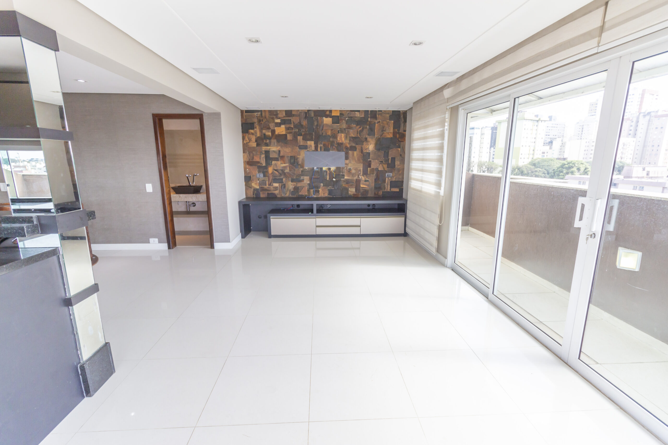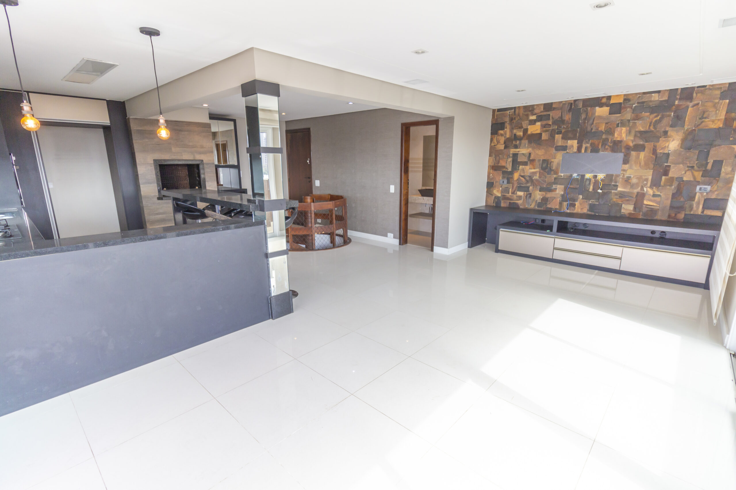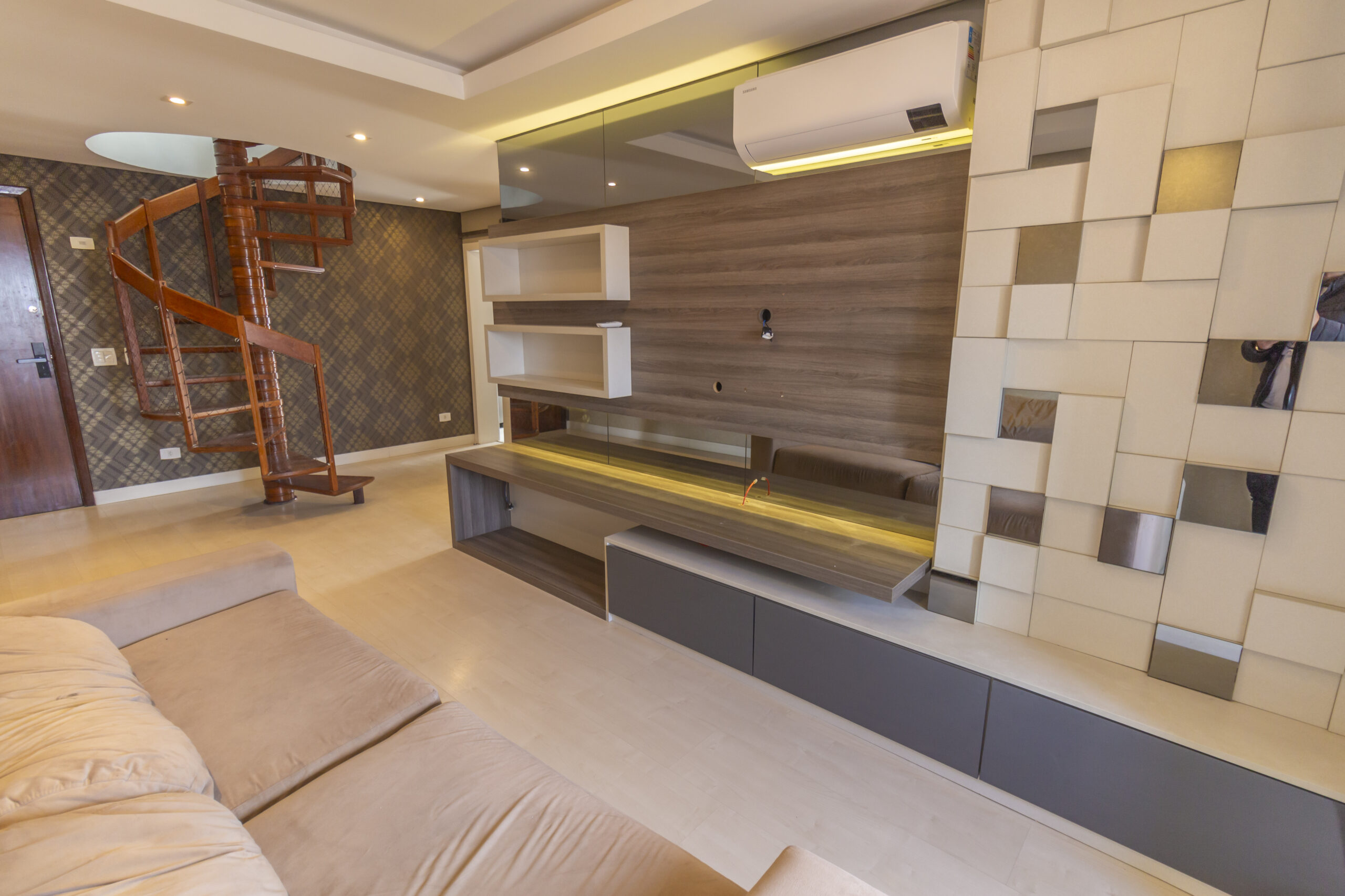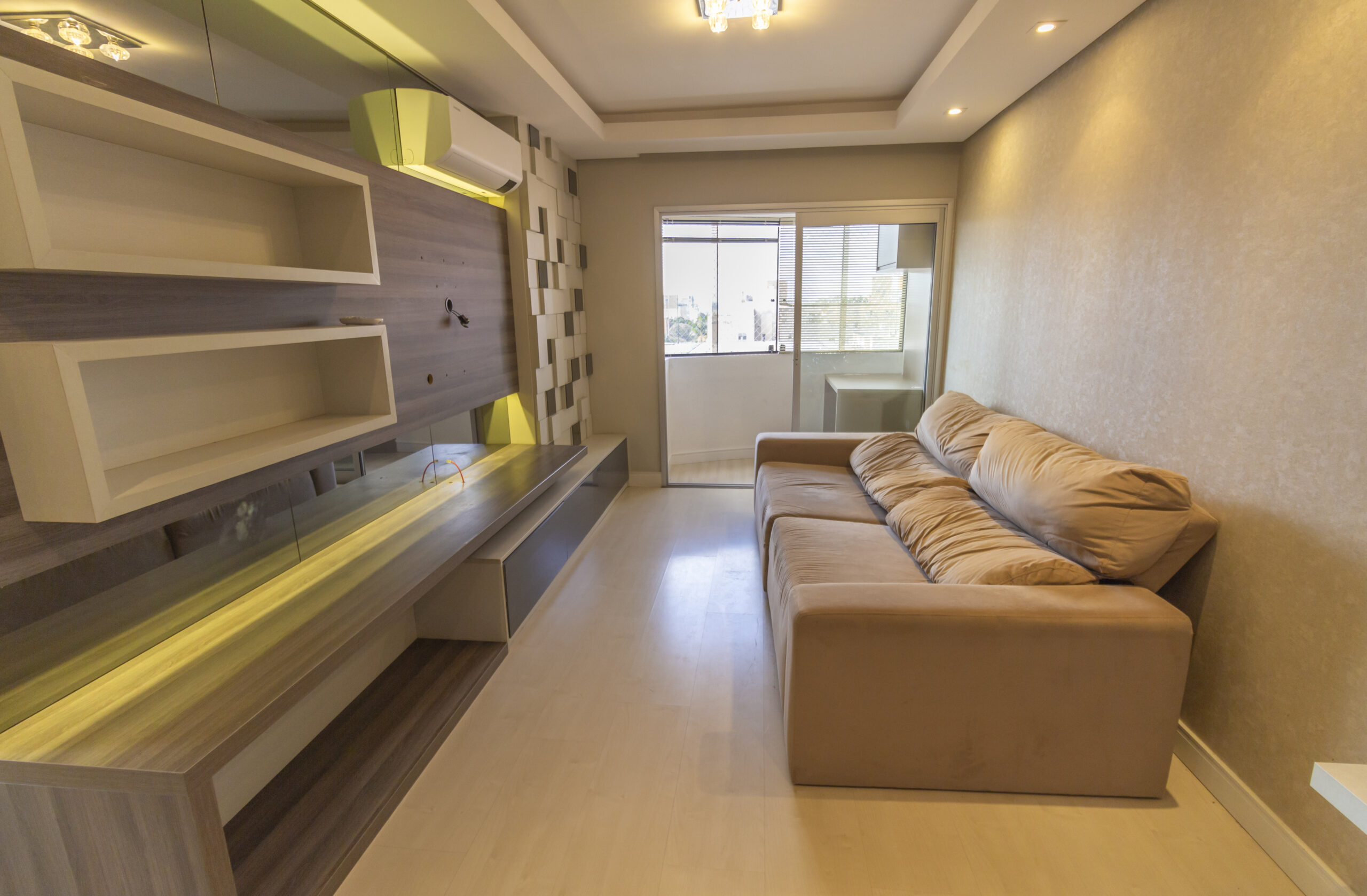 Sala ampla com painel de tv e ar-condicionado;