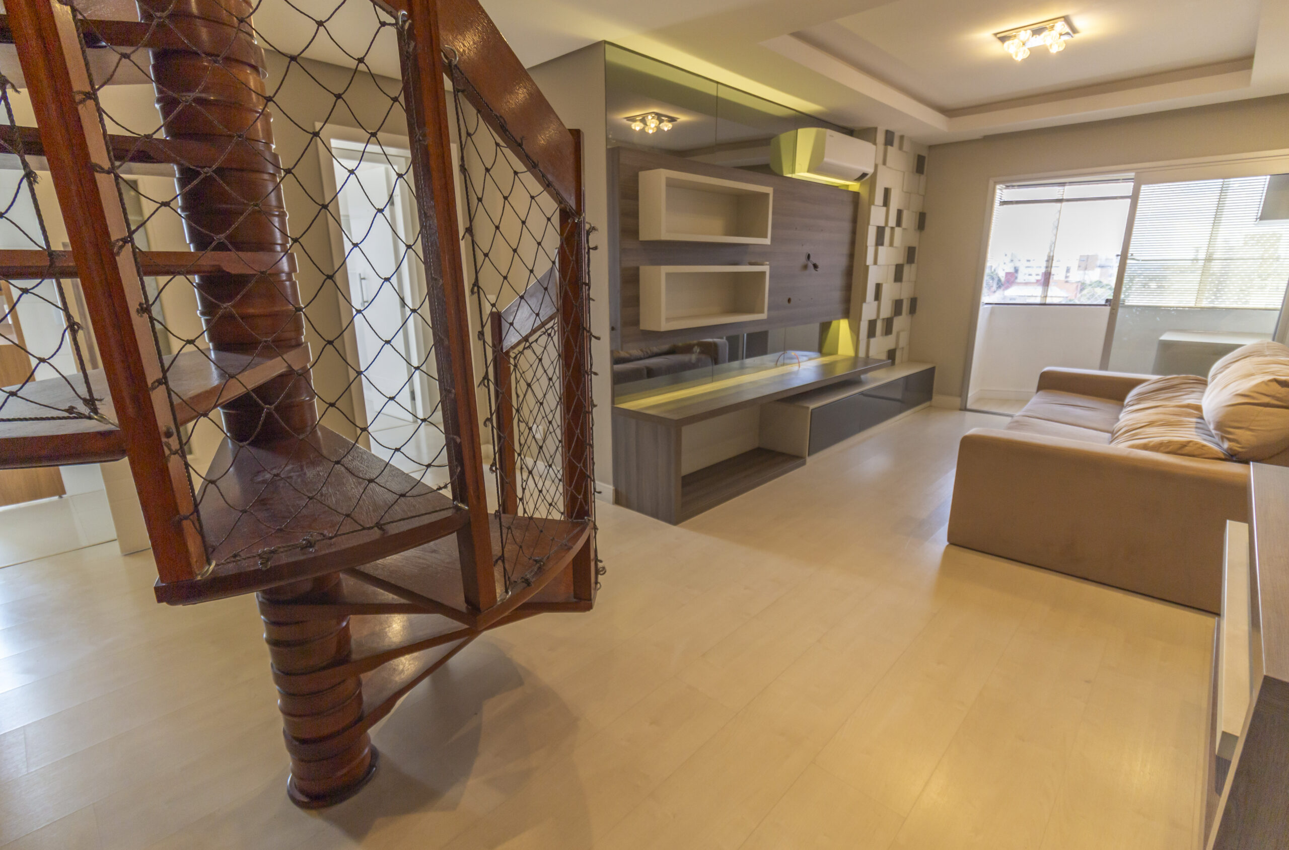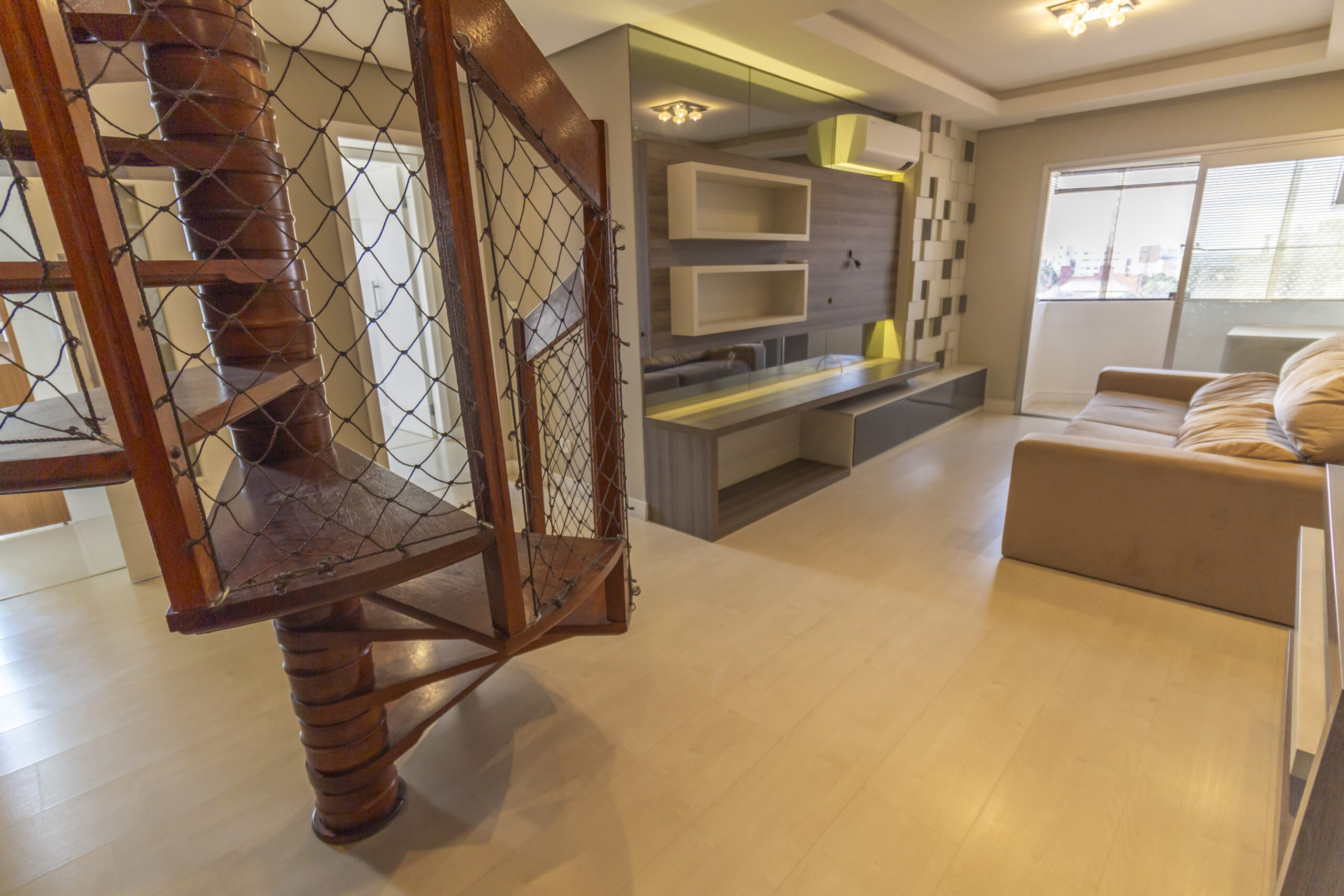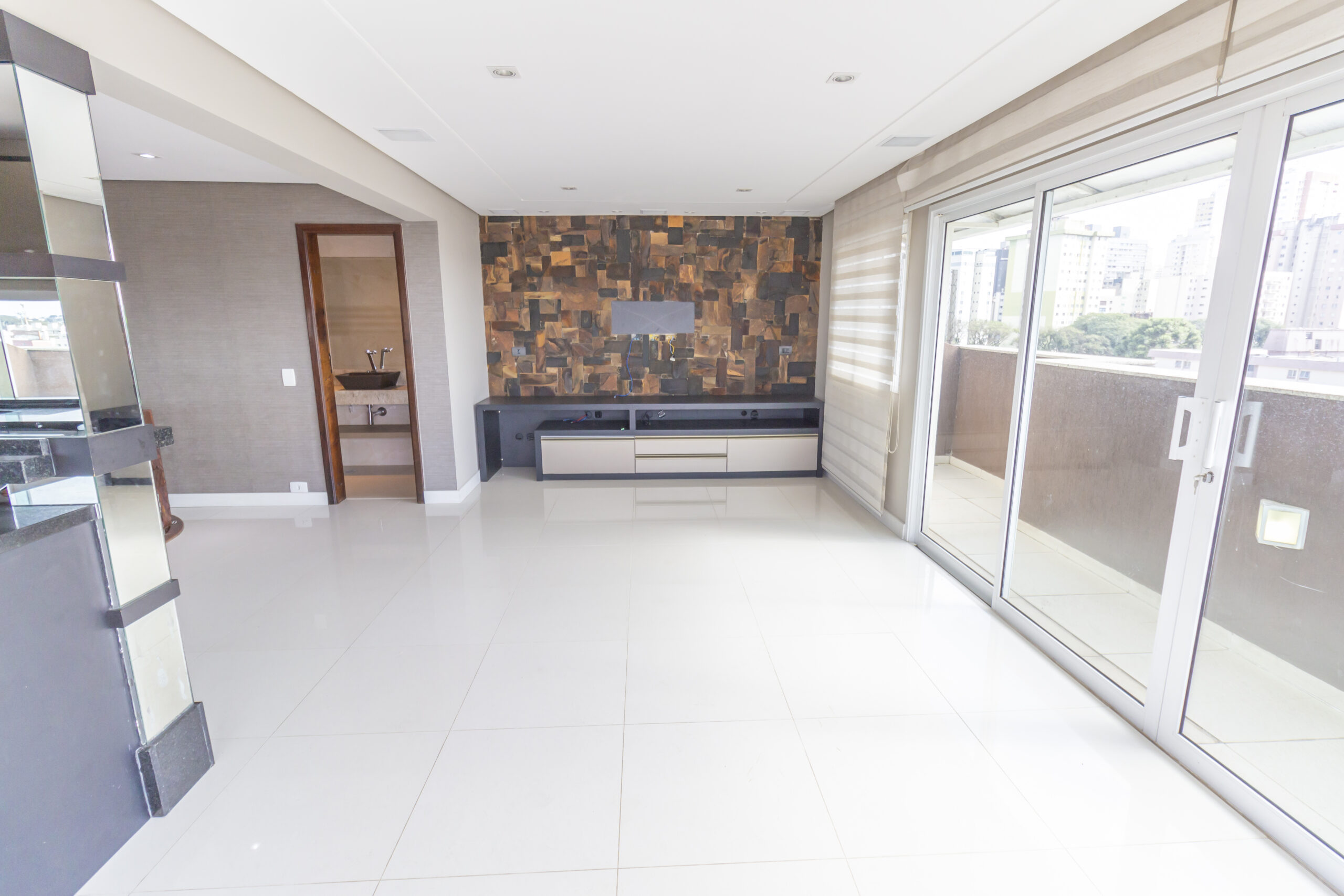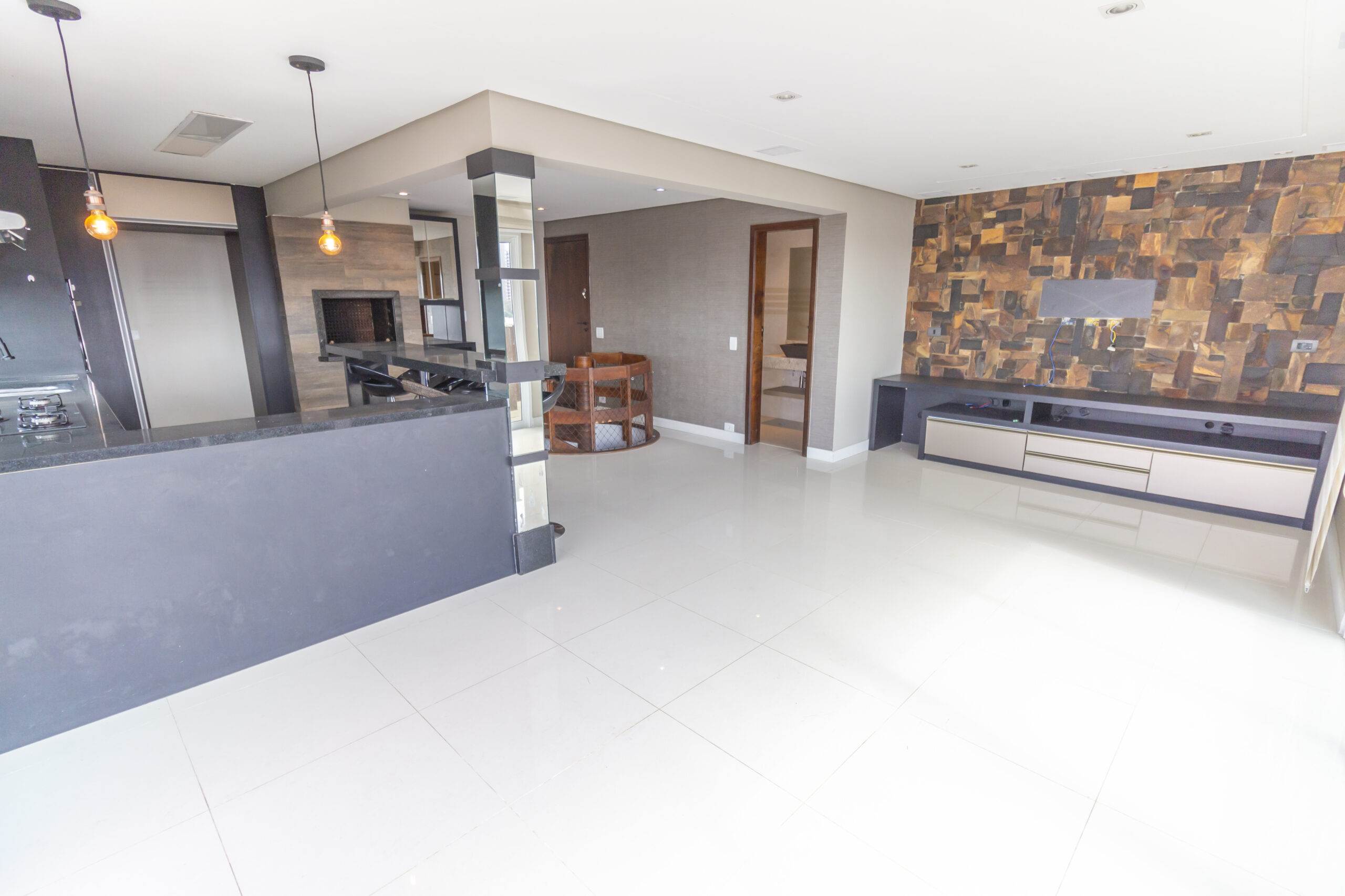 Sala ampla com painel de tv e ar-condicionado;