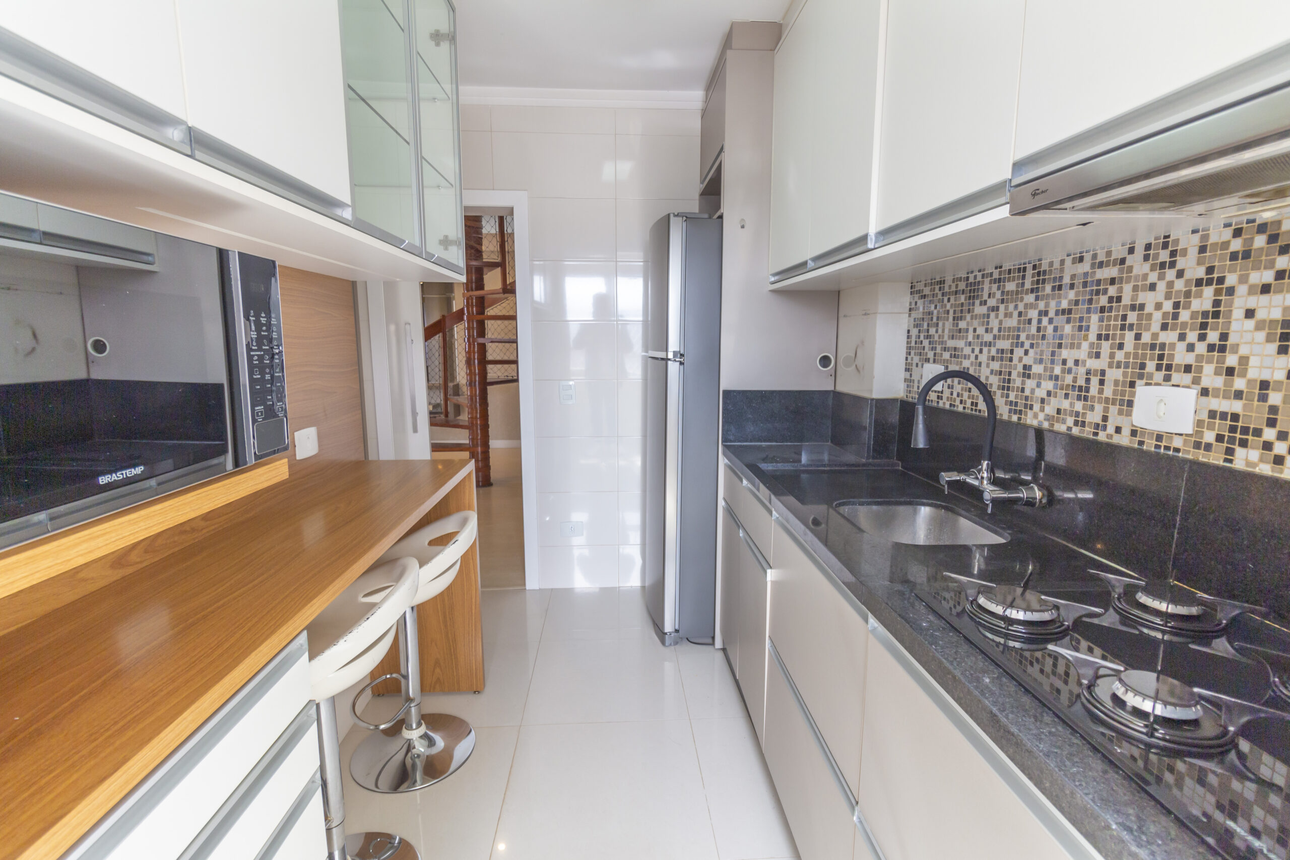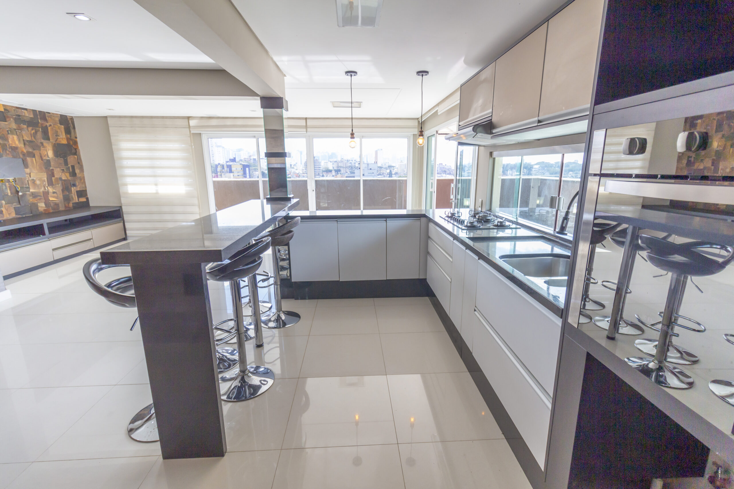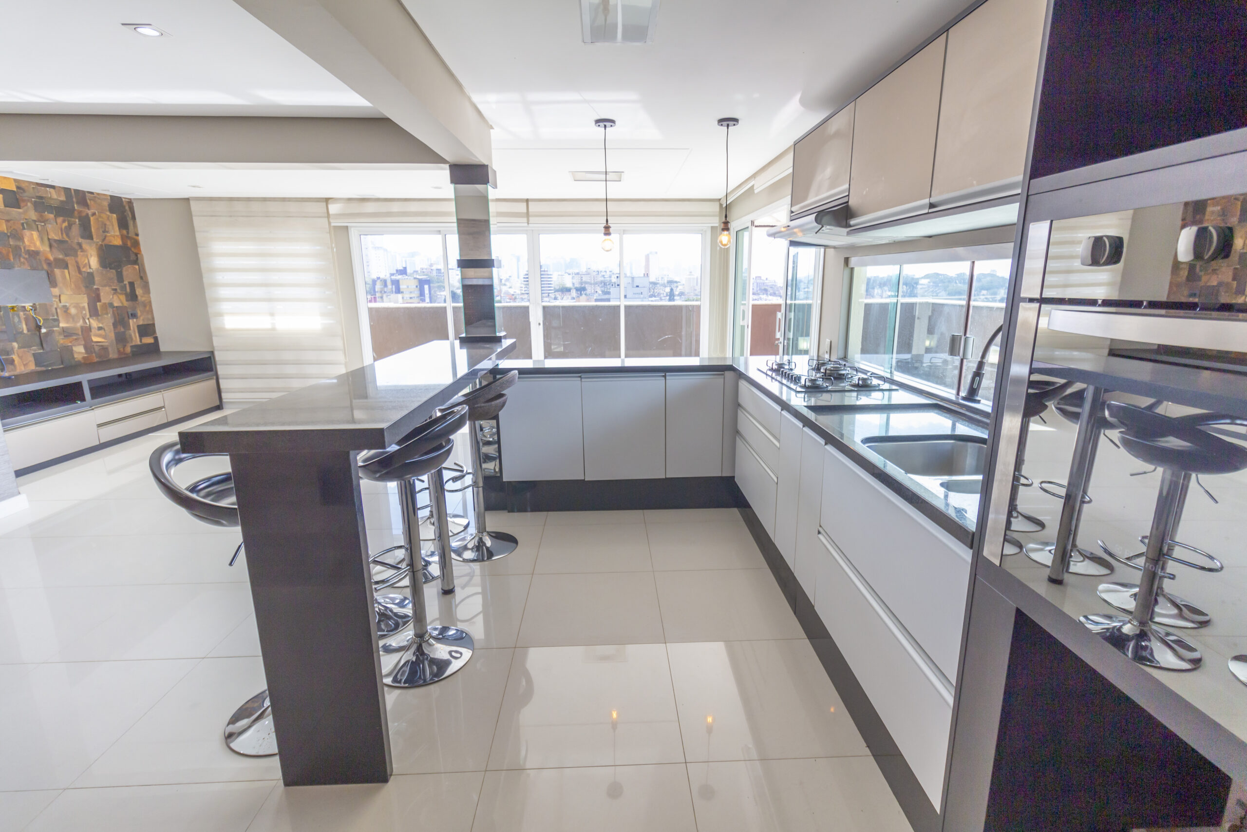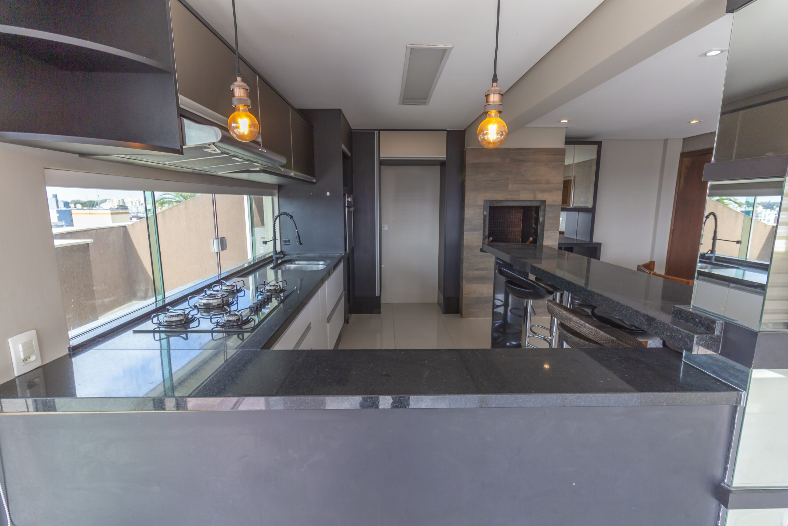 Cozinha gourmet com bancadas em granito;