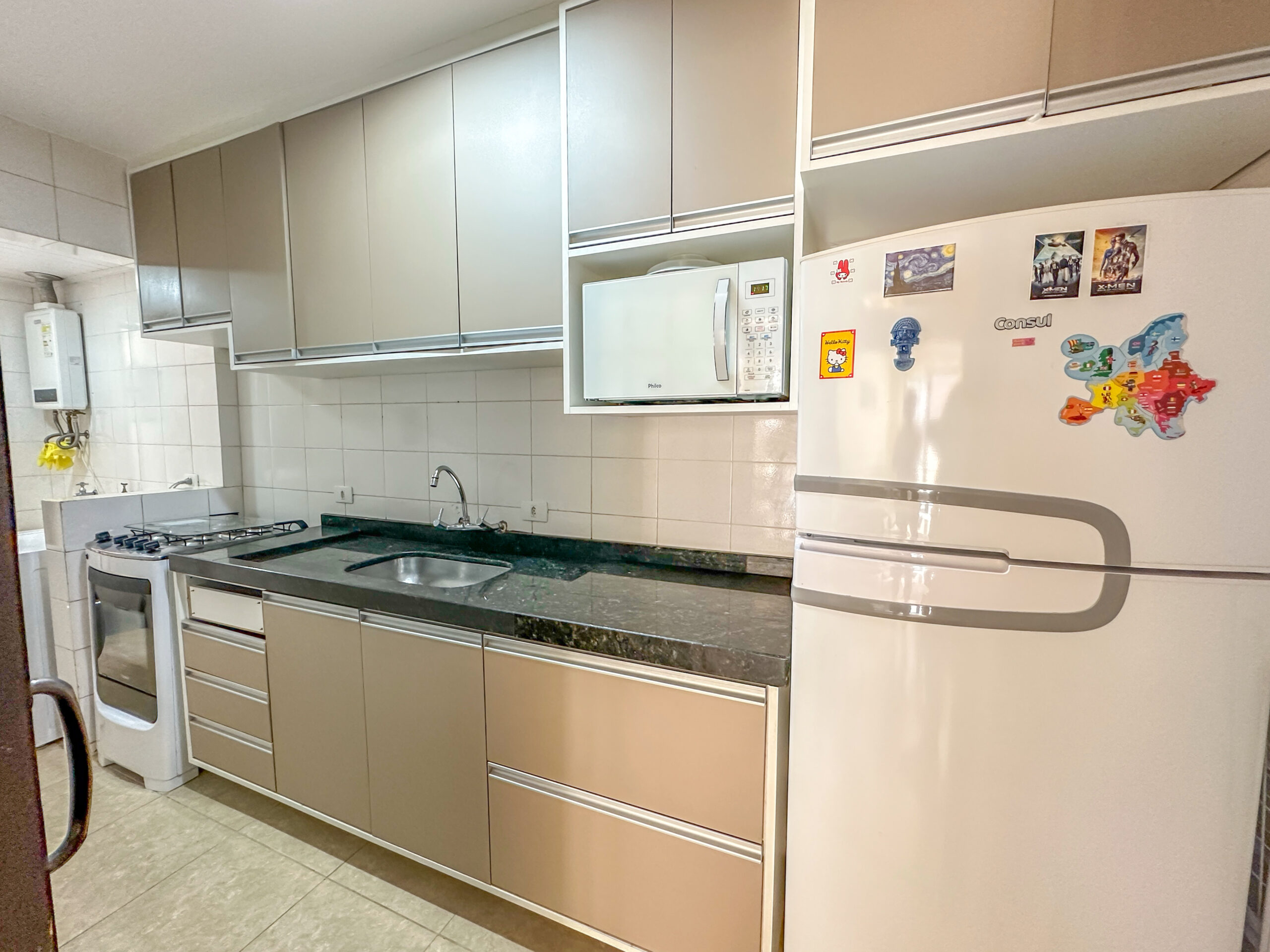 Cozinha separada com móveis planejados, fogão e geladeira;