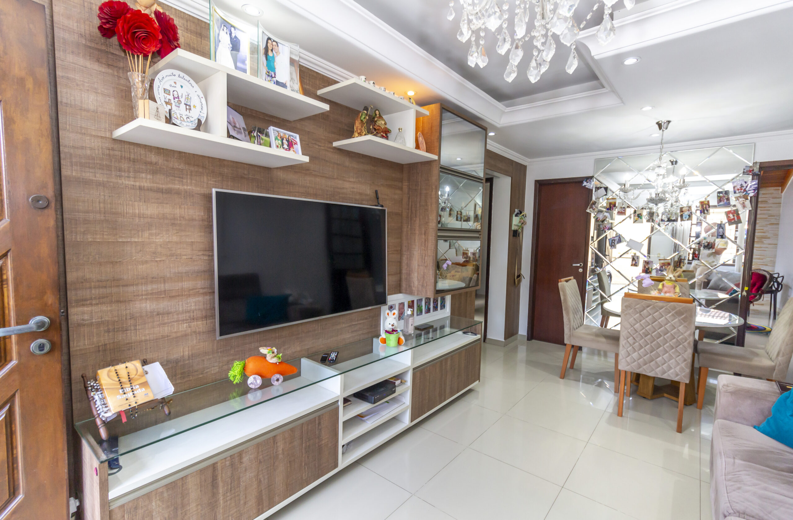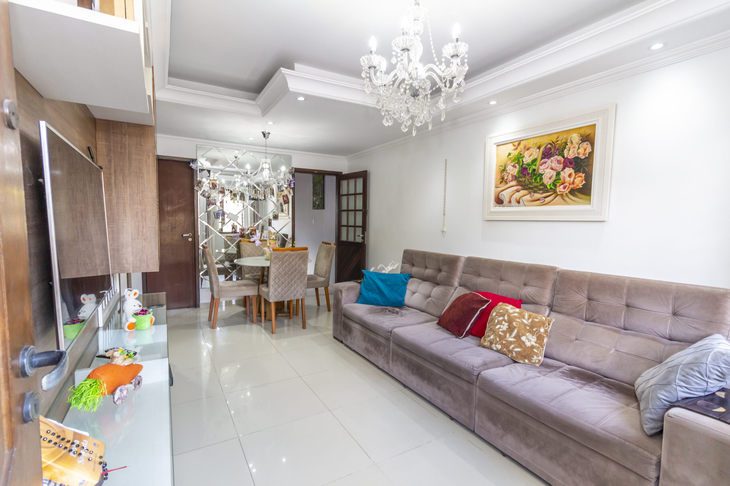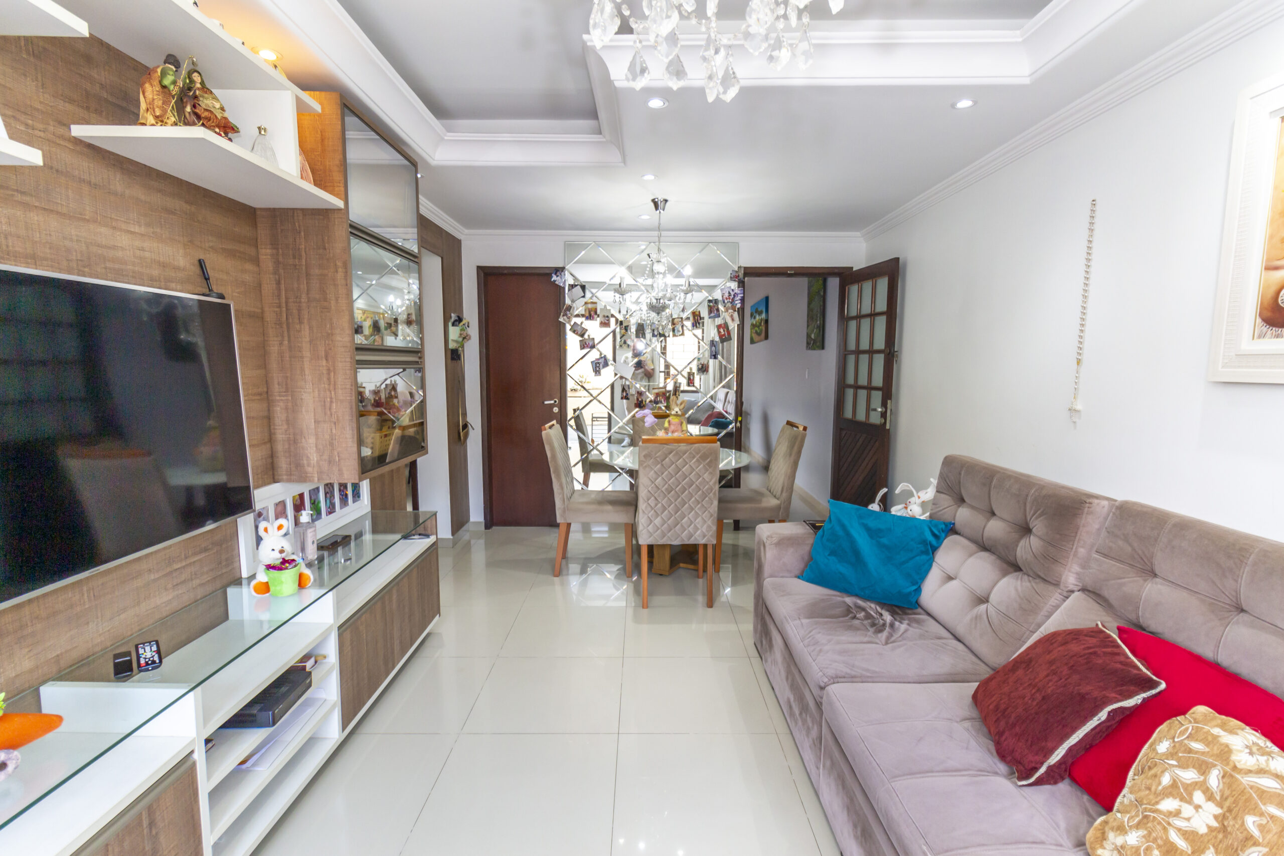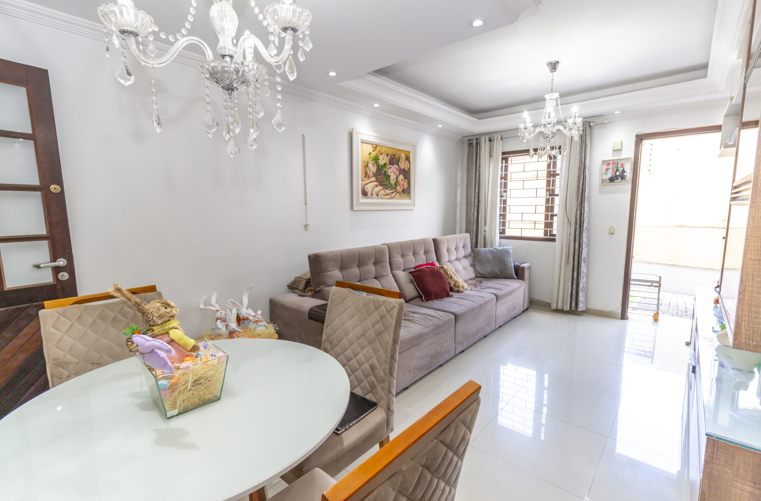 Sala para dois ambientes, com sofá e mesa com 4 cadeiras;